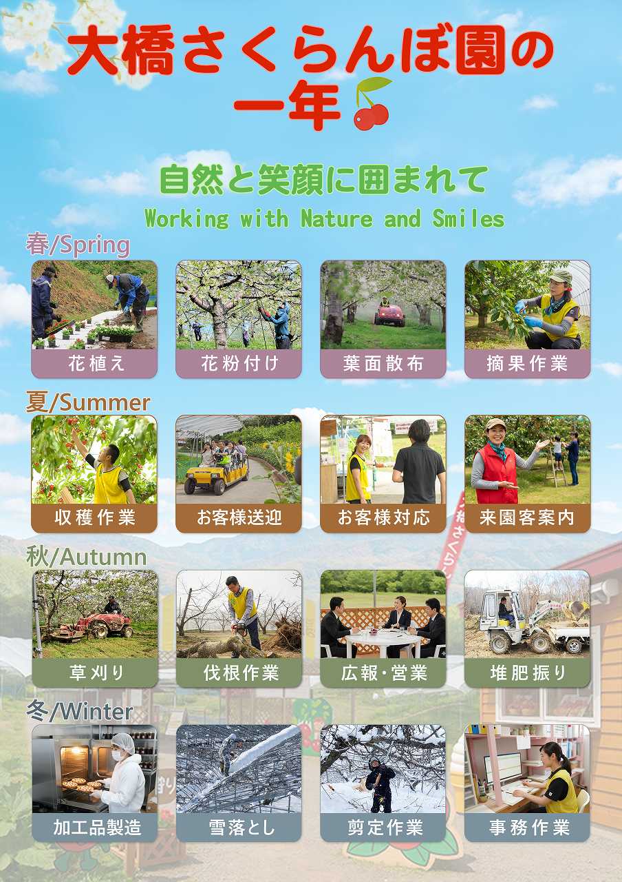 約60種類・1300本のさくらんぼが実る広大な畑で、四季の中でさまざまな作業に関わる“果樹農業”のお仕事です。