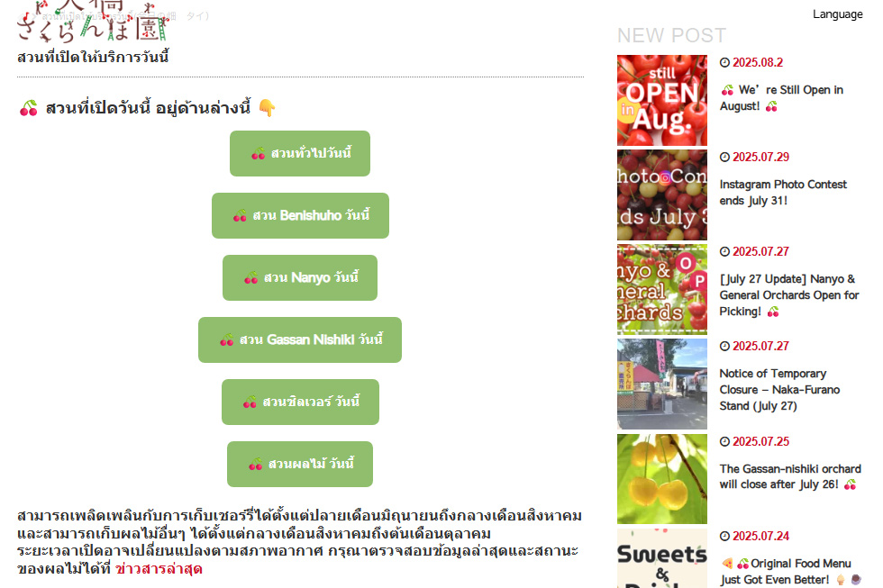 | วันหยุด | ในช่วงฤดูเก็บเชอร์รี่ เปิดทำการทุกวันโดยไม่มีวันหยุด ในช่วงฤดูเก็บผลไม้อื่น ๆ เช่น พลัม บลูเบอร์รี่ แอปเปิ้ล เป็นต้น อาจมีการปิดให้บริการชั่วคราวในกรณีฝนตก ขออภัยในความไม่สะดวก นอกจากนี้ เนื่องจากขนาดของสวนผลไม้ค่อนข้างเล็ก จึงอาจหมดเร็วกว่าที่คาดไว้ กรุณาตรวจสอบข้อมูลล่วงหน้า สวนจะปิดให้บริการในช่วงปลายปีถึงต้นปี (ประมาณวันที่ 27 ธันวาคม ถึง 5 มกราคม) |