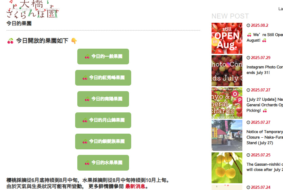 為了讓您每次來訪都能品嚐到熟成的櫻桃,我們採用果園輪替方式開放採摘。👉 點擊這裡查看今天開放的果園!